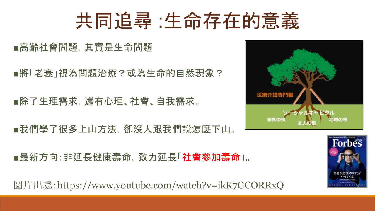 日本高齡照護的新方向,已不僅是延長(臥床)壽命,而是致力於延長「社會參與壽命」。講者引用佐佐木淳醫生提出的概念-維持人類根源的是「家族之根、朋友之根、社區之根」,「社會資本」是維持生命的關鍵,因此要創造即使年老或身體不便也依然可以持續與社區連結的可能性。長照工作除了需要專業人員陪伴,更是需要推展到社區共同支持,將照護融入日常與未來的教育中,形成社會的支持系統。