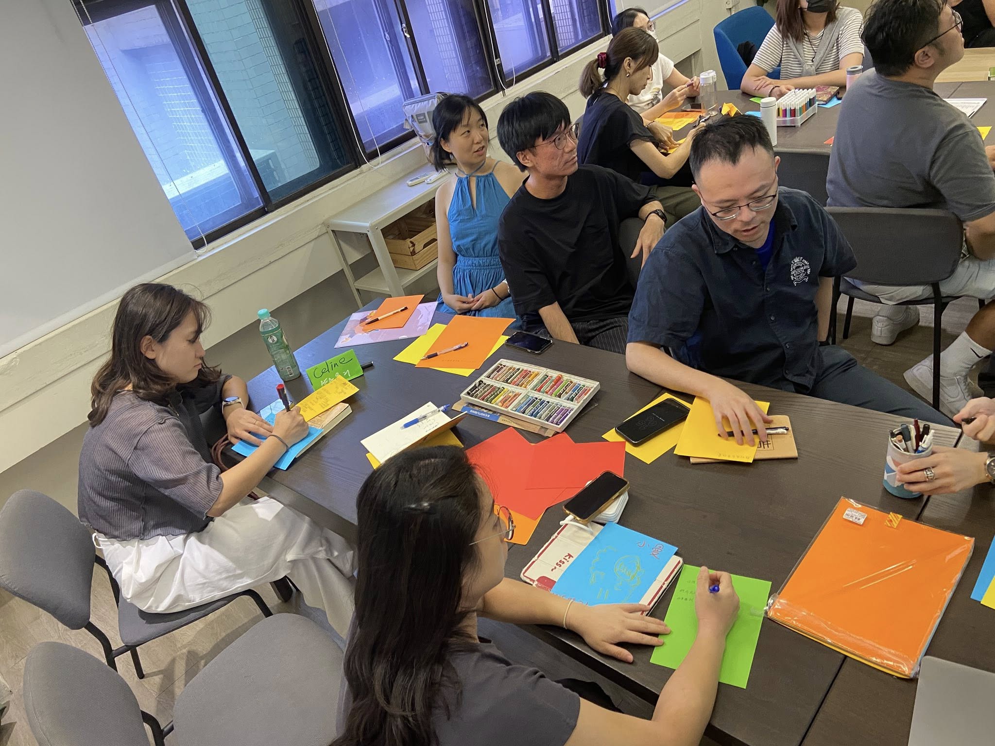 9/21的工作坊主要分為上下兩場次講座,由Art For All共同創辦人謝思盈主持,在兩個場次間,邀請大家以反思性筆記(reflective journaling)形式,加入和講題相關討論,大家聆聽講者20分鐘實務經驗分享後,動手選取喜歡的畫筆材料和彩色紙張。與會者在自畫像、短記(Scratch notes)和速寫(sketching)的創作活動,來回應思盈和講者拋出的提問。最後,開放所有與會者向講者提問或經驗交流。